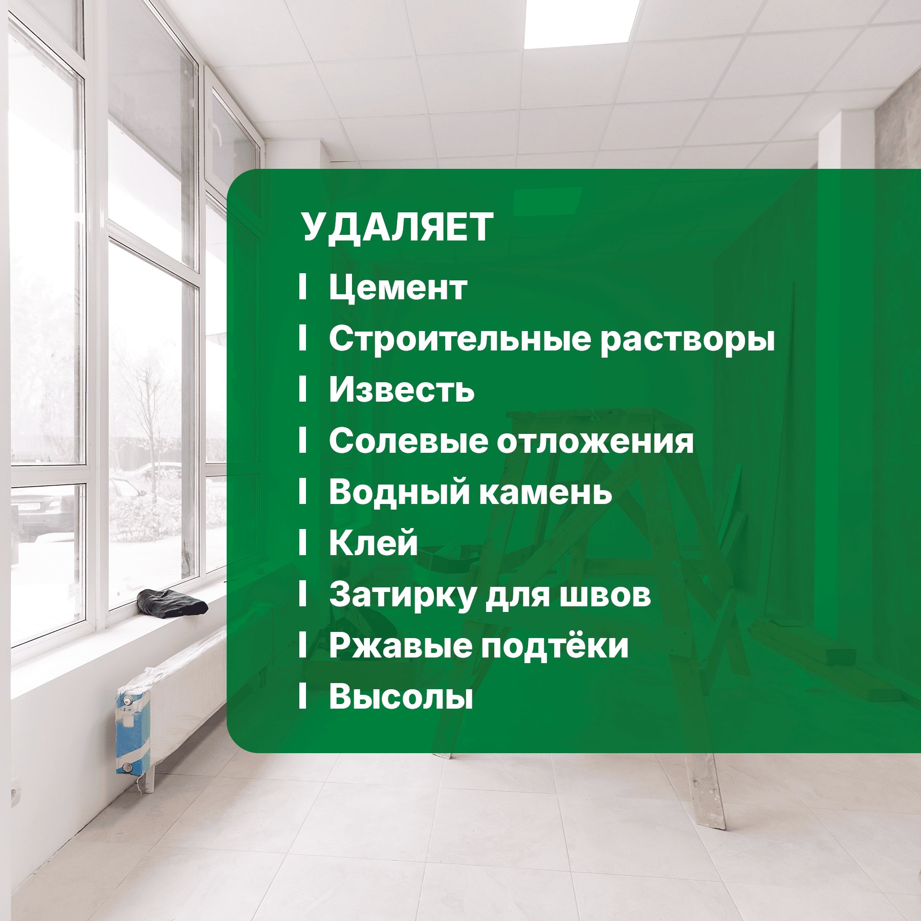 Чистящее средство для уборки после строительных и ремонтных работ. Эффективно удаляет цемент, затирки для швов, строительные растворы, ржавый и известковый налет, клей, высолы и другие загрязнения. Очищает и освежает поверхность, придавая ей ухоженный и завершенный вид.