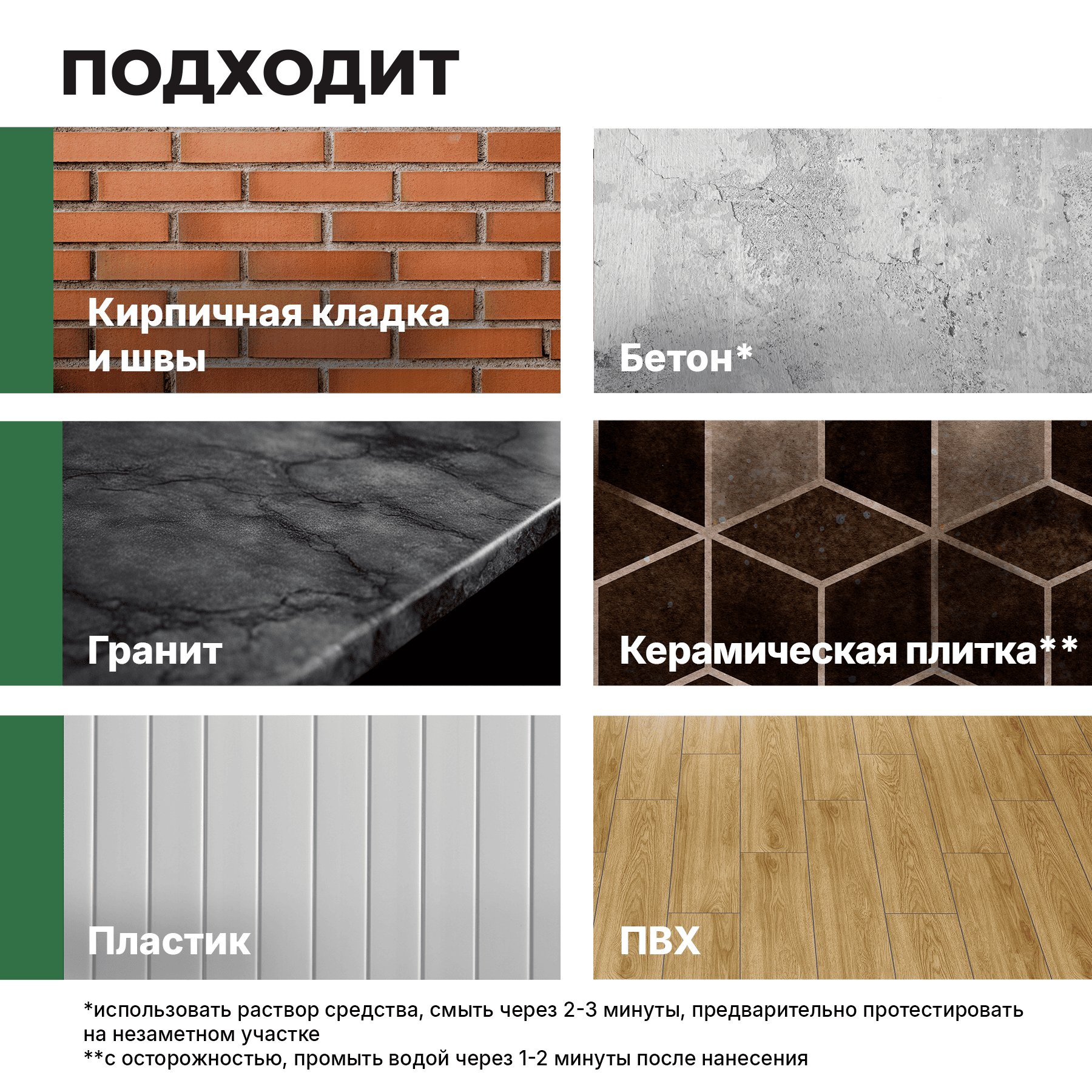 Средство применяется для очистки кирпичной кладки и швов, гранита, плитки и других кислотостойких поверхностей.