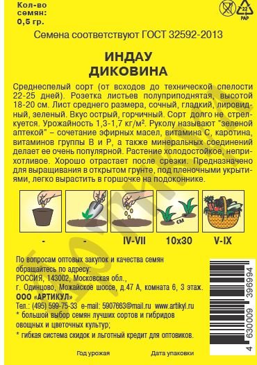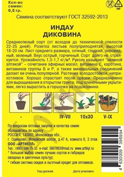 -24%Индау «Диковина» — среднеспелый сорт с приподнятой розеткой листьев высотой 18-20 см. Однолетник. Имеет интересный аромат и пикантный вкус с горчинкой. Сбор листьев начинают уже через 18-20 дней после первых всходов. Листья подходят в качестве гарнира к мясу и рыбе, добавляются в салаты. Особенности - Влаголюбивость. - Холодостойкость. - Богатый витаминный состав. - Долго сохраняет потребительские качества. - Поздно стрелкуется.