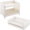 Универсальная настольная этажерка может использоваться на кухне, в ванной комнате, в прихожей для хранения всевозможных вещей. На кухне этажерка используется для размещения специй, растительного масла, сахарницы, салфетницы или миски с печеньем. На ней могут быть расположены моющие средства и губки. В ванной комнате полочка-этажерка подойдет для хранения косметики и средств для умывания, на ней все принадлежности будут содержаться в порядке и находиться под рукой. В прихожей изделие будет кстати для обувных кремов и щеток. Приспособление станет отличным помощником в жилом помещении — для размещения канцелярских принадлежностей, бумаг и прочих предметов. Изготовлено из пластмассы (полипропилен).