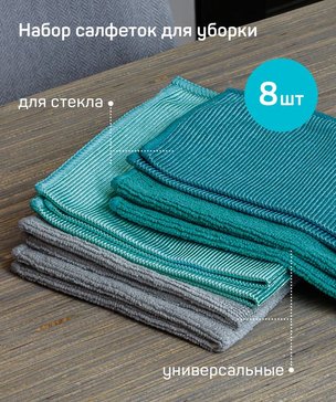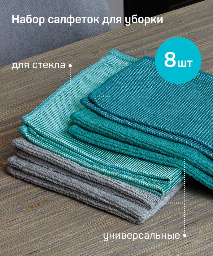 Набор салфеток из микрофибры, 8 шт. 30х30см - 4шт (2 универсальные, 2 для стекла), 20х20см - 4шт. (2 универсальные, 2 для стекла). Состав (материал): микрофибра (80% полиэстер, 20% полиамид)