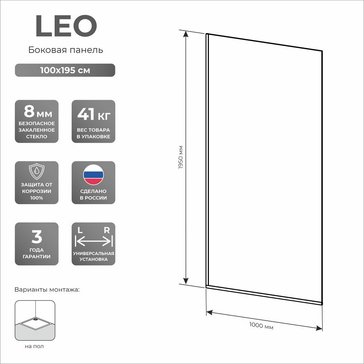 - Ограждение душевое LEO 100 ТОНИРОВАННЫЙ на профиле к полу и стене 100х195см 8мм