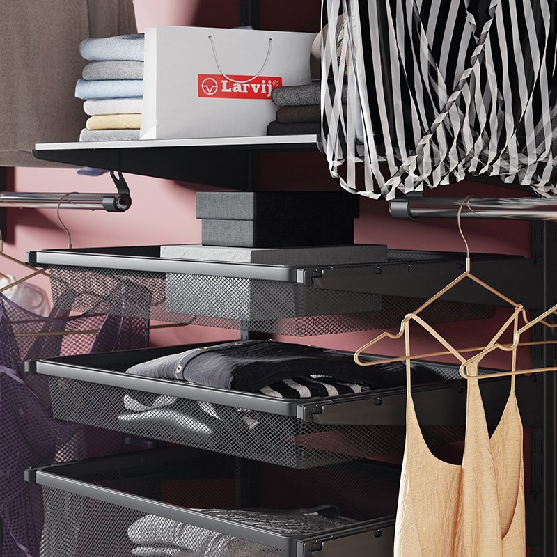 Стальная выдвижная рама для корзин Larvij устанавливается на кронштейны. Предназначена для обеспечения механизма выдвижения корзин для хранения. Выступает в качестве крепления мелкосеточных корзин L9560 и L9559 и сеточных корзин L9529 и L9530. Устанавливается на кронштейны серии L9240.