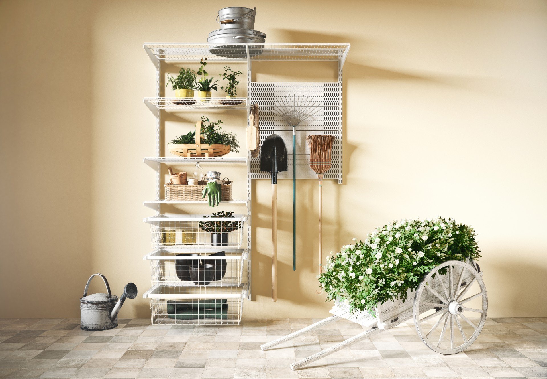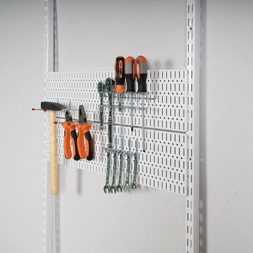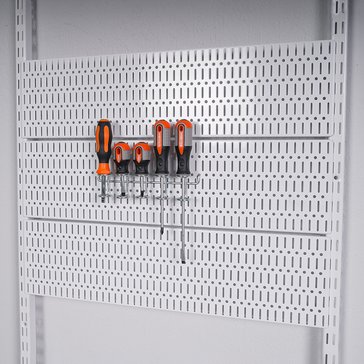 Перфорированная панель - интересное решение для вертикального хранения инструментов, бытовых принадлежностей и прочих предметов, позволяющее размещать большое количество вещей на малом пространстве. Принцип устройства перфорированной панели подобен принципу навешивания кронштейнов на стойки перфорации, но роль кронштейнов в данной ситуации выполняют крючки.