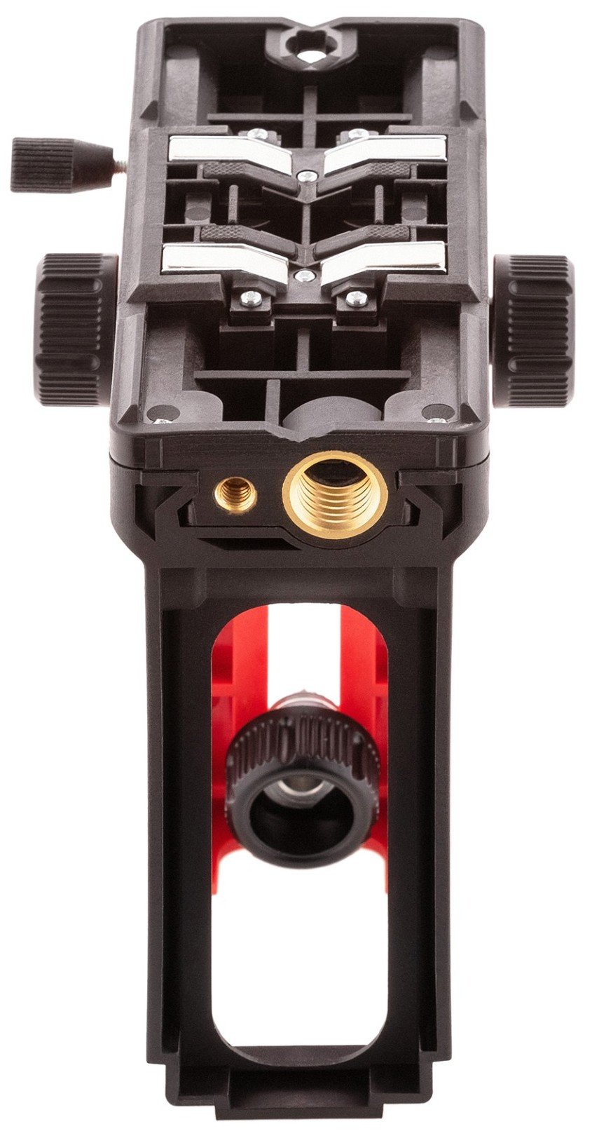 Два вида резьбы. Для установки на штативе в нижней части крепления две резьбы 1/4 и 5/8 дюйма. Для установки уровня используется крепежный винт 1/4 дюйма и переходник на резьбу 5/8 дюйма.