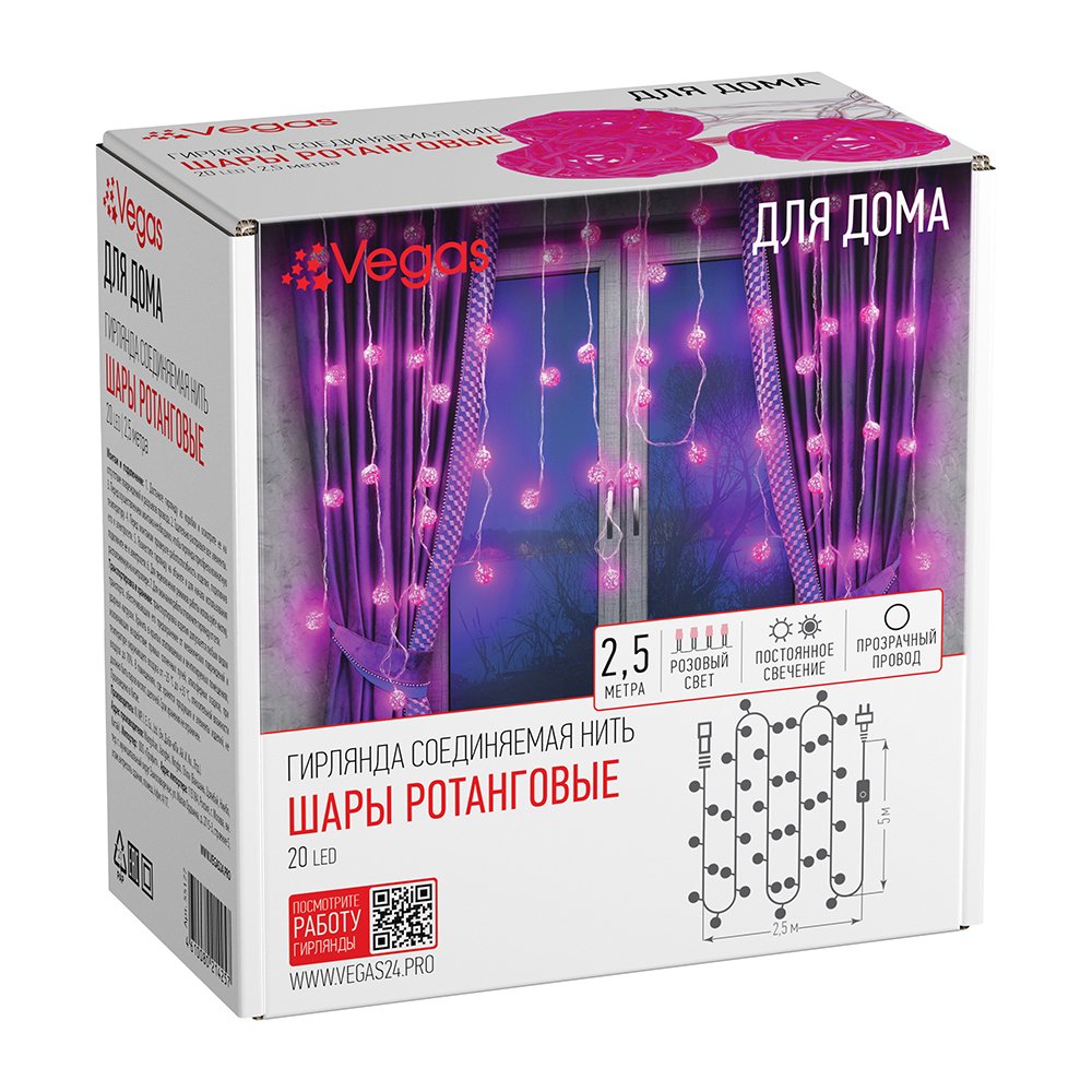 - Электрогирлянда Нить VEGAS Шары ротанговые 2,5м розовый