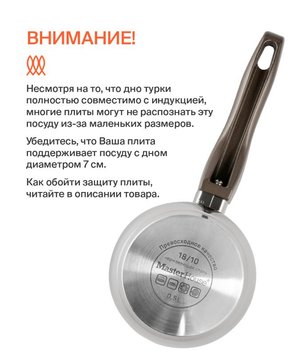Особенности: Подходит для индукции (конфорка должна быть совместима с посудой диаметром 7см). Диаметр горла 8,3см Высота 10см Материал нержавеющая сталь, капсулированное индукционное дно - алюминиевая вставка 2мм, индукционный диск нерж. сталь SS430 Толщина стенок 0,8мм, дно: 3,30 мм.