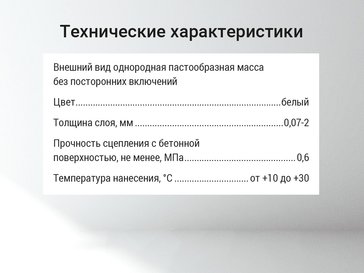 - экологически безопасный материал, без запаха! ; - высокопластичная, легко наносится и заглаживается ; - идеальна для тонкокослойного выравнивания; - абсолютно гладкая поверхность - категория К 4; - трещиностойкая; - легко шлифуется; - высокая паропроницаемость
