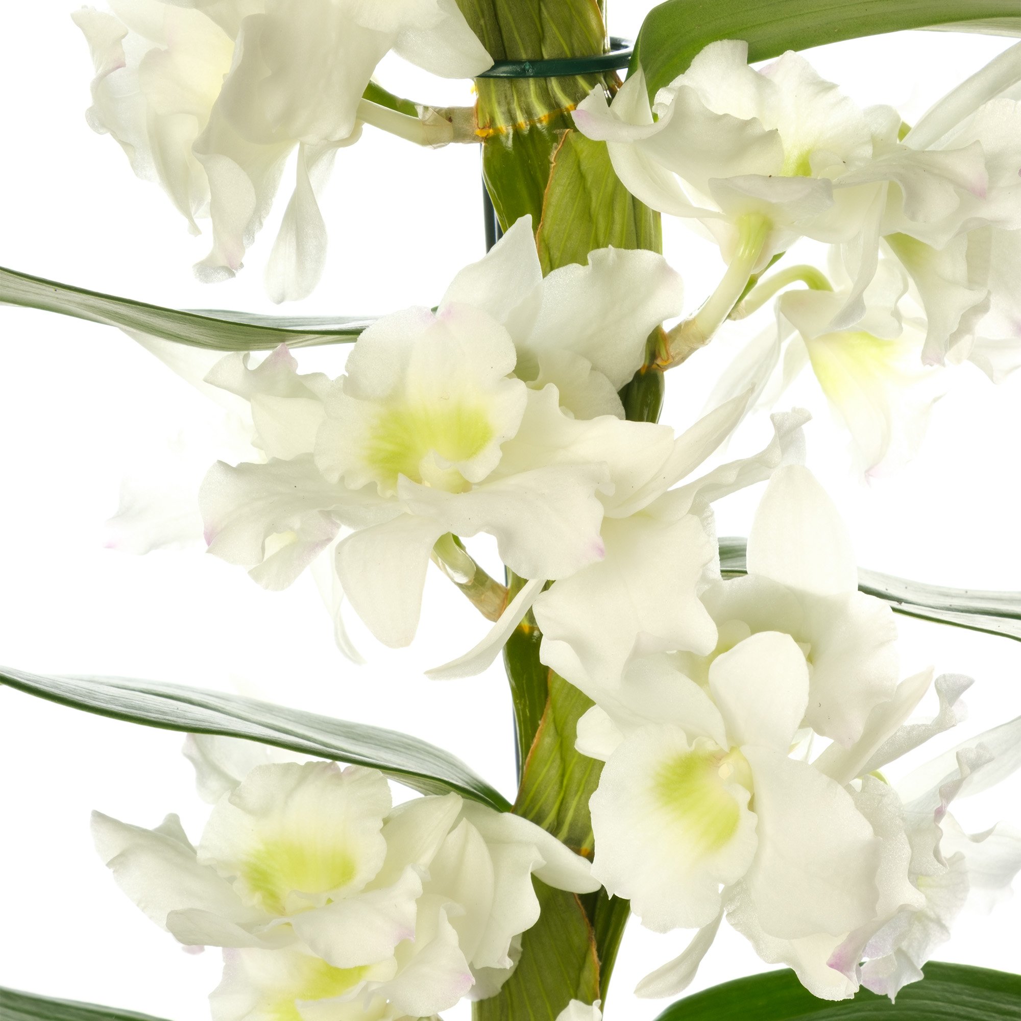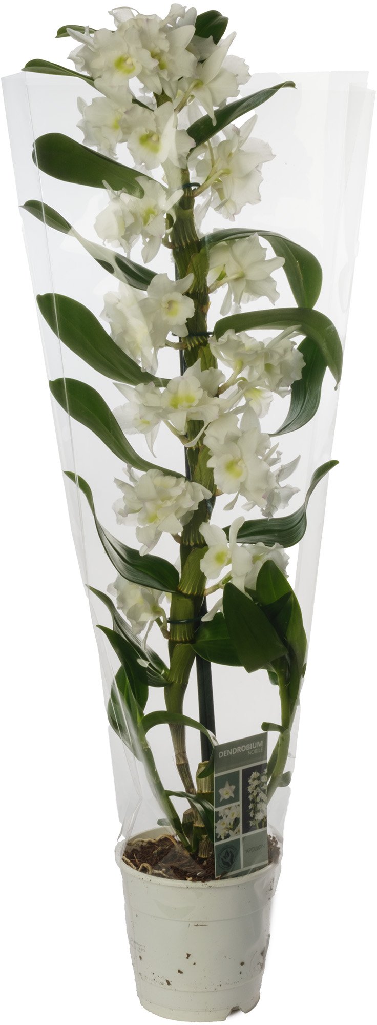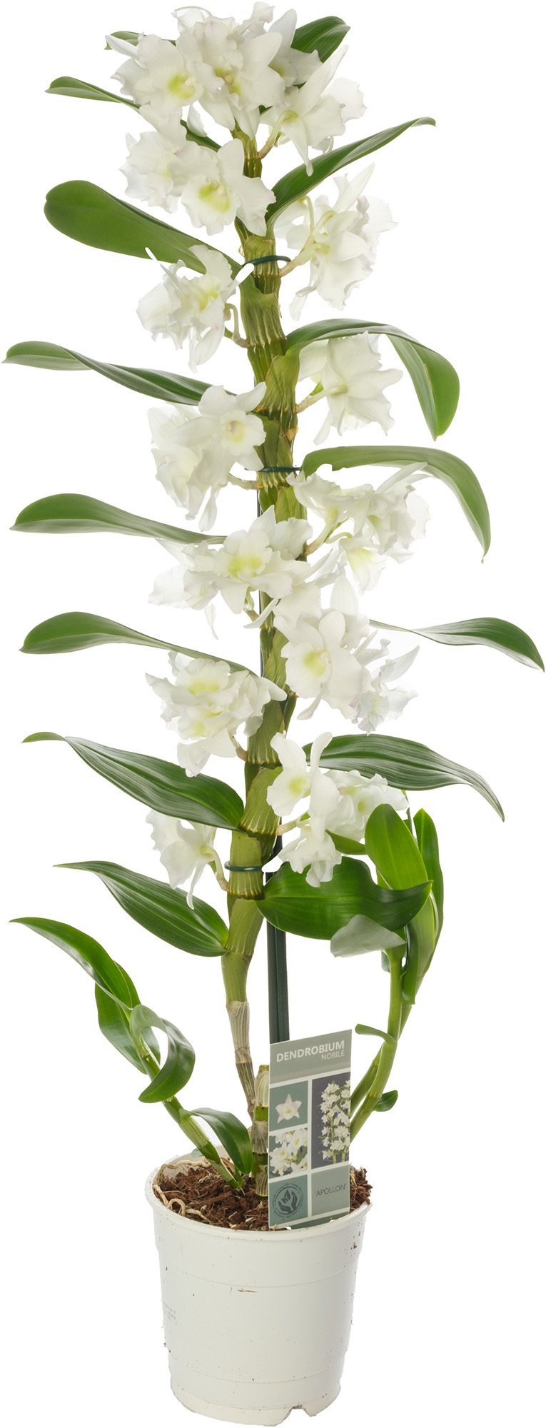 Орхидея Дендробиум Нобиле Аполлон — эпифитное комнатное растение, состоящее из сегментрованного стебля. Максимальная высота — 90 см. Количество листьев увеличивается ежегодно в среднем на 2-3 штуки. Цветоносы короткие. Бутоны формируются достаточно крупные, до 9 см в диаметре. Растению обеспечивают хорошую освещенность без попадания прямых солнечных лучей. Влажность поддерживают на высоком уровне. Летом полив должен быть регулярным. Между орошениями грунту дают полностью просыхать. Для подкормки используют специальные удобрения для орхидей, содержащие азот, калий и фосфор.