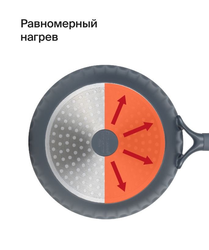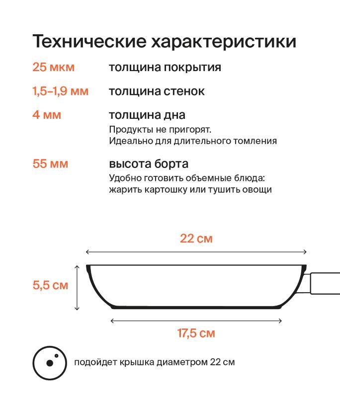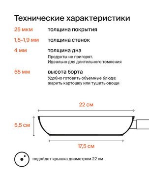 Благодаря своему диаметру 22 см и толщине 5,5 см, сковорода обеспечивает равномерное распределение тепла и быстрое приготовление пищи. Она также имеет удобные ручки, которые не нагреваются во время готовки.