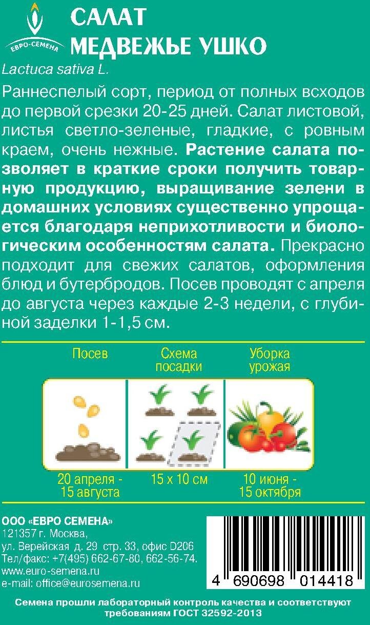 -30%Раннеспелый сорт, период от полных всходов до первой срезки 15-20 дней. Салат листовой, листья светло-зеленые, гладкие, с ровным краем, очень нежные. Растение салата позволяет в краткие сроки получить товарную продукцию, выращивание зелени в домашних условиях существенно упрощается благодаря неприхотливости и биологическим особенностям салата. Прекрасно подходит для свежих салатов, оформления блюд и бутербродов. Посев проводят с апреля до августа через каждые 2-3 недели, с глубиной заделки 1-1,5 см.