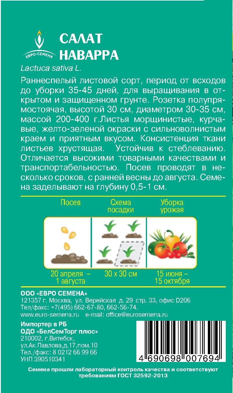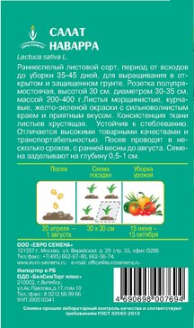 -30%Раннеспелый листовой сорт, период от всходов до уборки 35-45 дней, для выращивания в открытом и защищенном грунте. Розетка полупрямостоячая, высотой 30 см, диаметром 30-35 см, массой 200-400 г. Листья морщинистые, курчавые, желто-зеленой окраски с сильноволнистым краем и приятным вкусом. Консистенция ткани листьев хрустящая. Устойчив к стеблеванию. Отличается высокими товарными качествами и транспортабельностью. Посев проводят в несколько сроков, с ранней весны до августа. Семена заделывают на глубину 0,5-1 см.