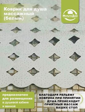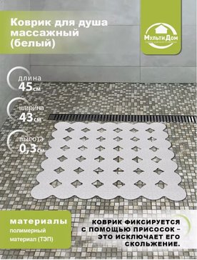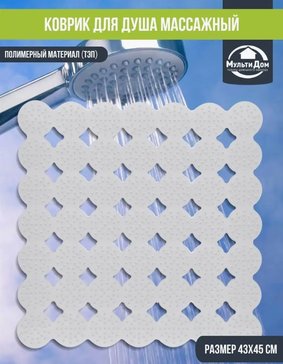 Хотите принять душ с утра с массажем стоп и зарядиться бодростью на весь день? Или расслабиться после трудового дня? Поможет коврик для душа массажный! Коврик массажный предназначен для размещения в душевой кабине и ванной. Благодаря рельефу коврика при принятии душа происходит приятный массаж ваших стоп. Коврик фиксируется с помощью присосок – это исключает его скольжение. На наших ступнях расположено более 250 акупунктурных точек, отвечающих за функционирование всего организма. Массаж стоп полезен для: -расслабления и снятия напряжения; -восстановления сил и энергии; -улучшения кровообращения и снабжения ног кислородом; -улучшения работы многих органов; -облегчения состояний при простудах, ОРВИ и различных вирусных заболеваниях; -снятия отеков; Благодаря разнообразию цветовой гаммы, коврик массажный украсит интерьер вашей ванной и может стать отличным подарком для ваших родных и близких. Изготовлен из полимерного материала (100% ТЭП), размер 43х45 см.