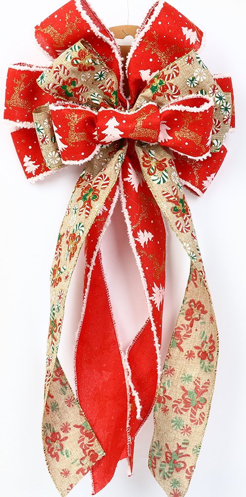 Яркий красно-золотой бант — идеальный акцент для новогоднего декора! Размер 25х55см делает его заметным, но не громоздким: он гармонично дополнит подарочную упаковку, ёлочную игрушку, праздничный венок или интерьерный ансамбль.