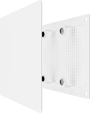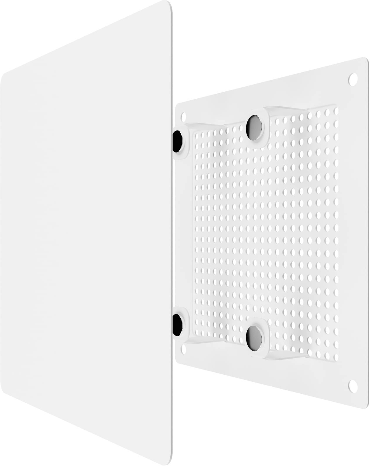 RVM состоит из двух частей. Рамка с сеткой и магнитами крепится к поверхности при помощи саморезов или клея, декоративная панель фиксируется на рамку с помощью магнитов, благодаря чему легко снимается для обслуживания решетки, скрывает вентиляционное отверстие и крепление рамки. За счет такой конструкции доступ воздуха в шахту не перекрывается и происходит его равномерное распределение.