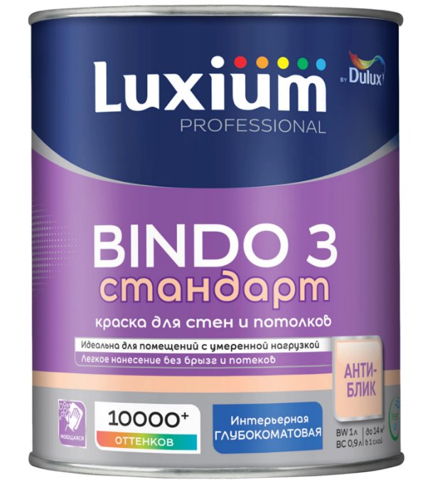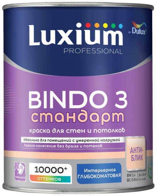 - Краска для стен и потолков Luxium BINDO 3 BW глубокоматовая белая (1л)