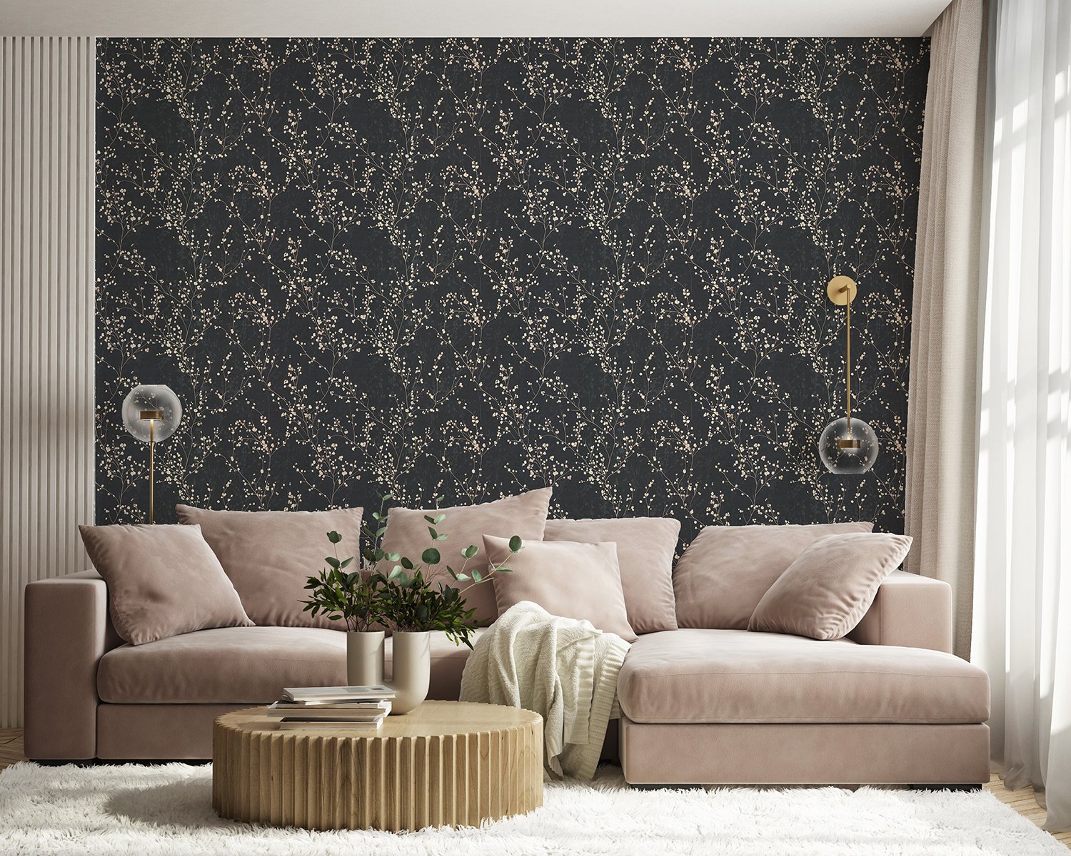 По абсолютно матовой поверхности коллекции «Виола» струятся изящные ветви с небольшими цветками. Деликатный рисунок напоминает объёмную ручную вышивку на благородной ткани. Интерферентные краски с перламутровым отливом подчёркивают затейливые изгибы, а редкие штрихи глиттера добавляет узору едва уловимое сияние.