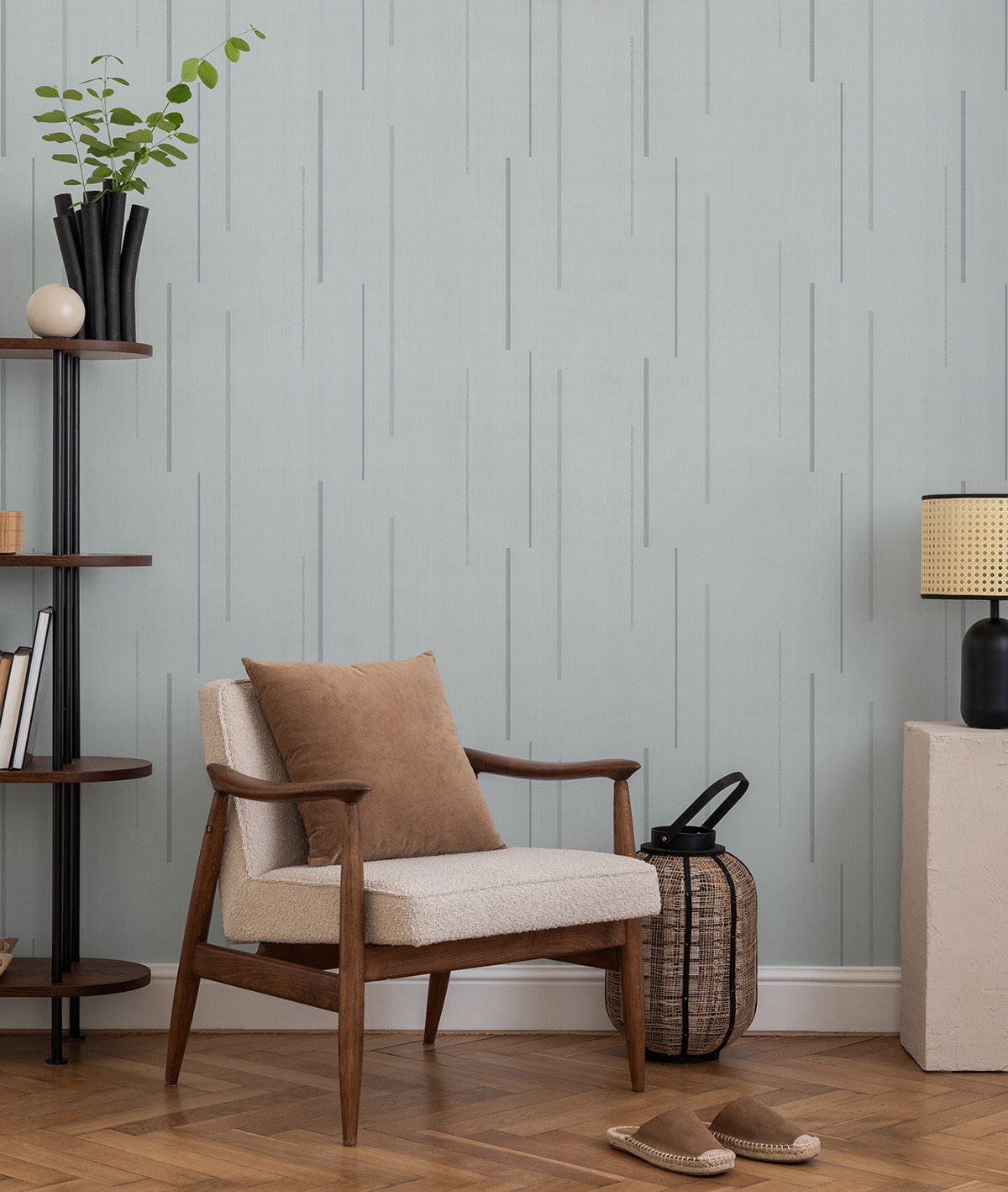 Обои отличаются насыщенными, стойкими цветами благодаря окрашиванию в массе и легко клеятся за счёт нулевого раппорта. Полуматовая фактура имитирует нежность замши, а геометрический узор оживает благодаря сочетанию интерферентного сияния и глиттерных переливов.