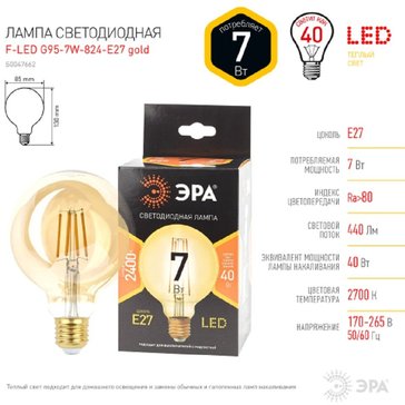 - Лампочка светодиодная ЭРА F-LED G95-7W-824-E27 gold E27 / Е27 7Вт филамент шар золотистый теплый белый свет