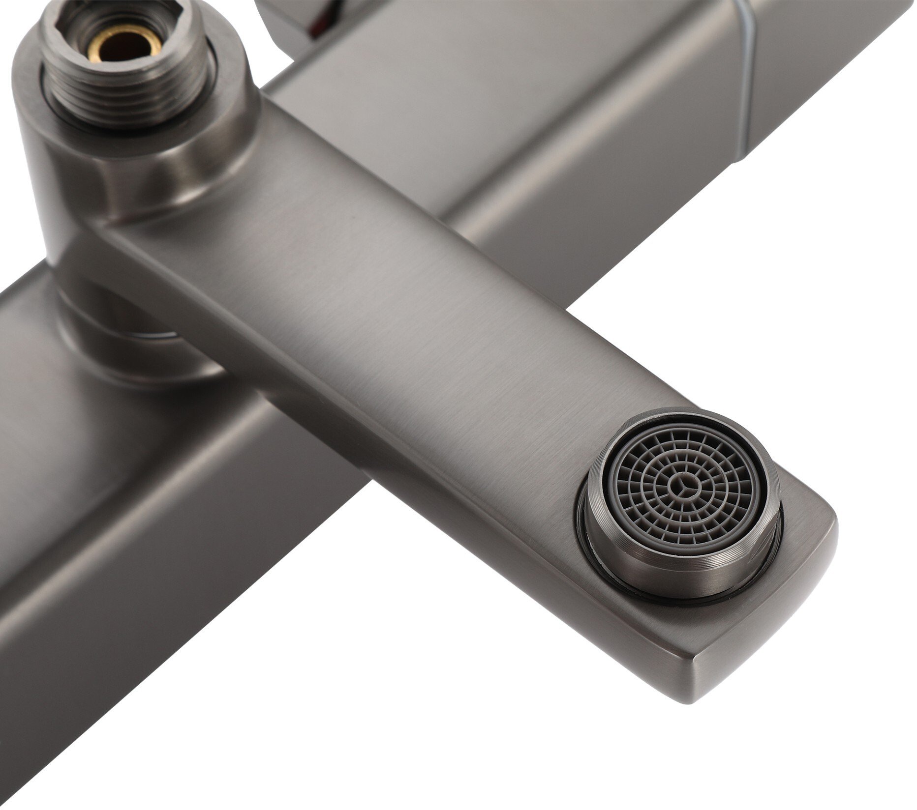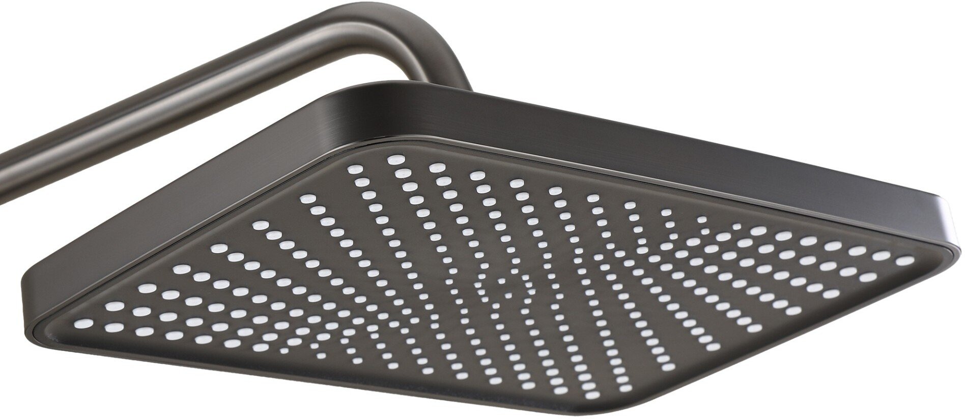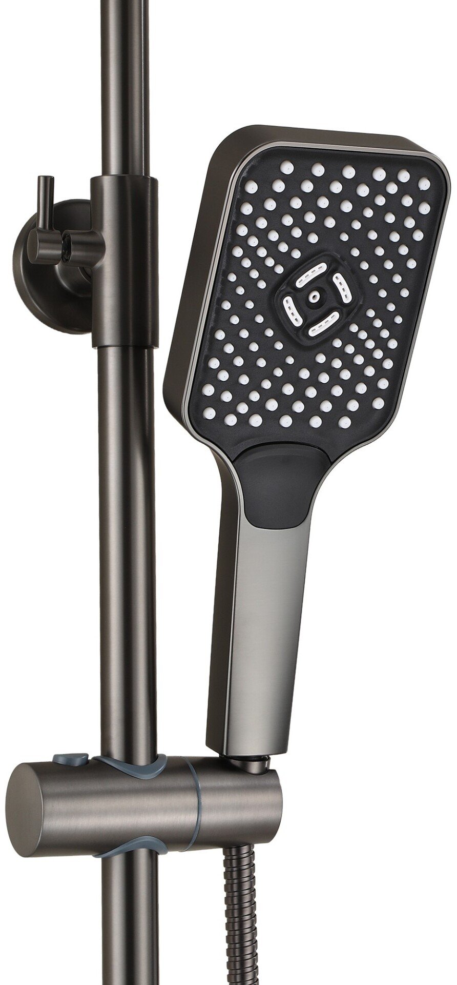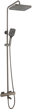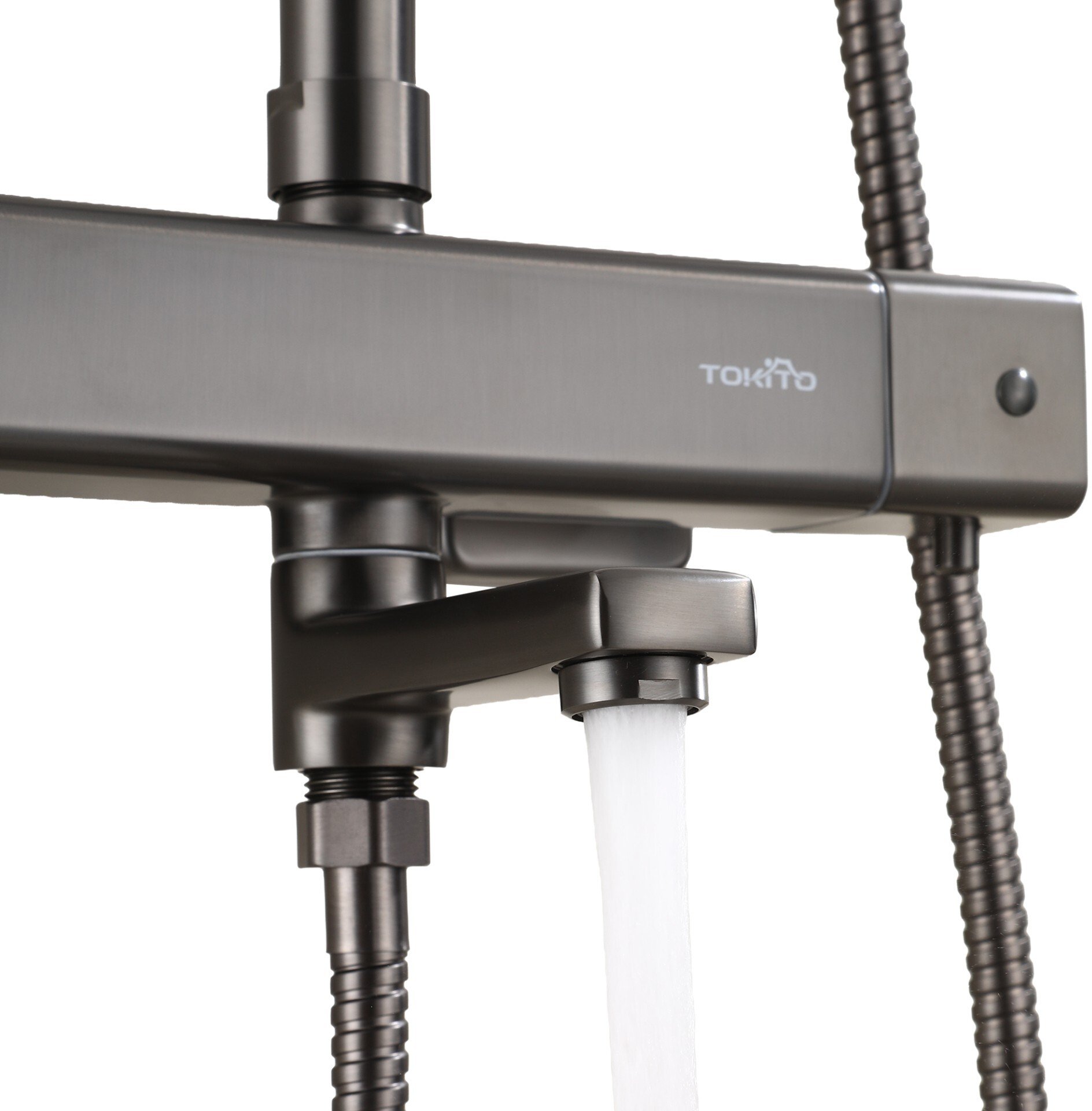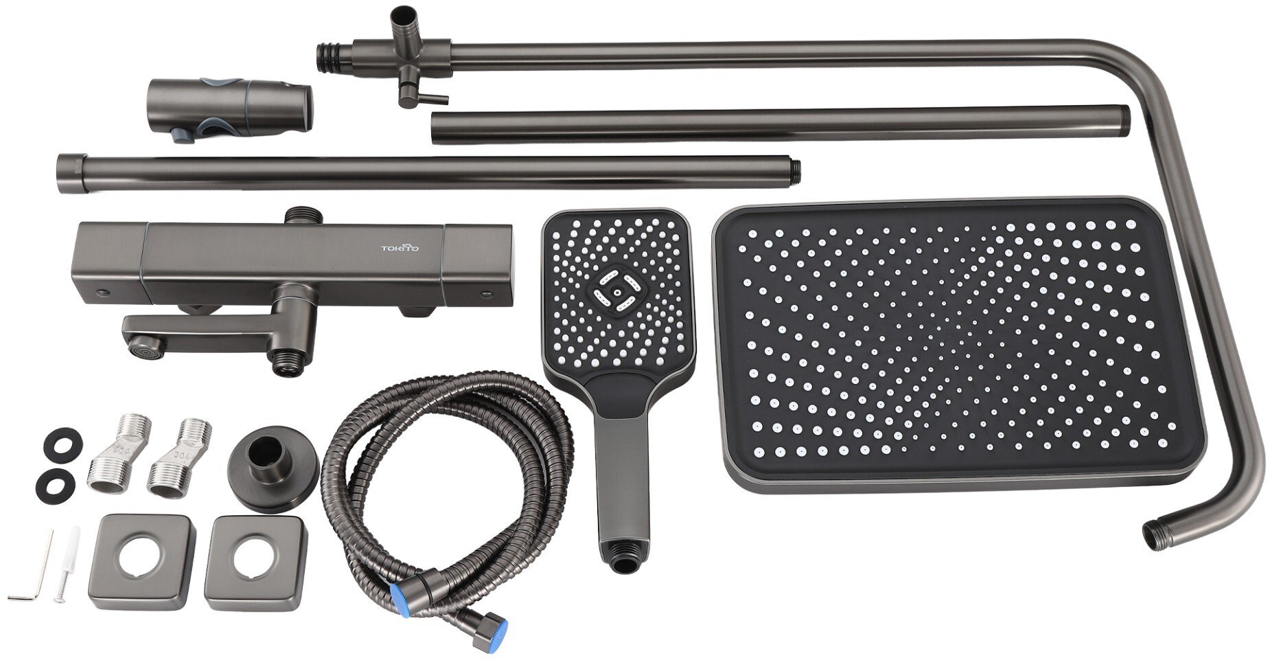 Душевая система TOKITO 1028GM с термостатическим смесителем воплощает современный подход к комфорту в ванной комнате. Её отличительная черта — надёжная термостатическая регулировка: достаточно задать желаемую температуру, и система будет стабильно поддерживать её, исключая неприятные перепады. Это делает водные процедуры безопасными и предсказуемыми, а также помогает рациональнее расходовать воду. Дизайн выполнен в сдержанной эстетике с отделкой «воронёная сталь»: приглушённый металлический оттенок придаёт изделию лаконичность и технологичность. Система органично вписывается в интерьеры с минималистичной или индустриальной стилистикой, добавляя пространству выразительности без излишней яркости. Продуманная конструкция и качественные материалы создают ощущение надёжности и долговечности.