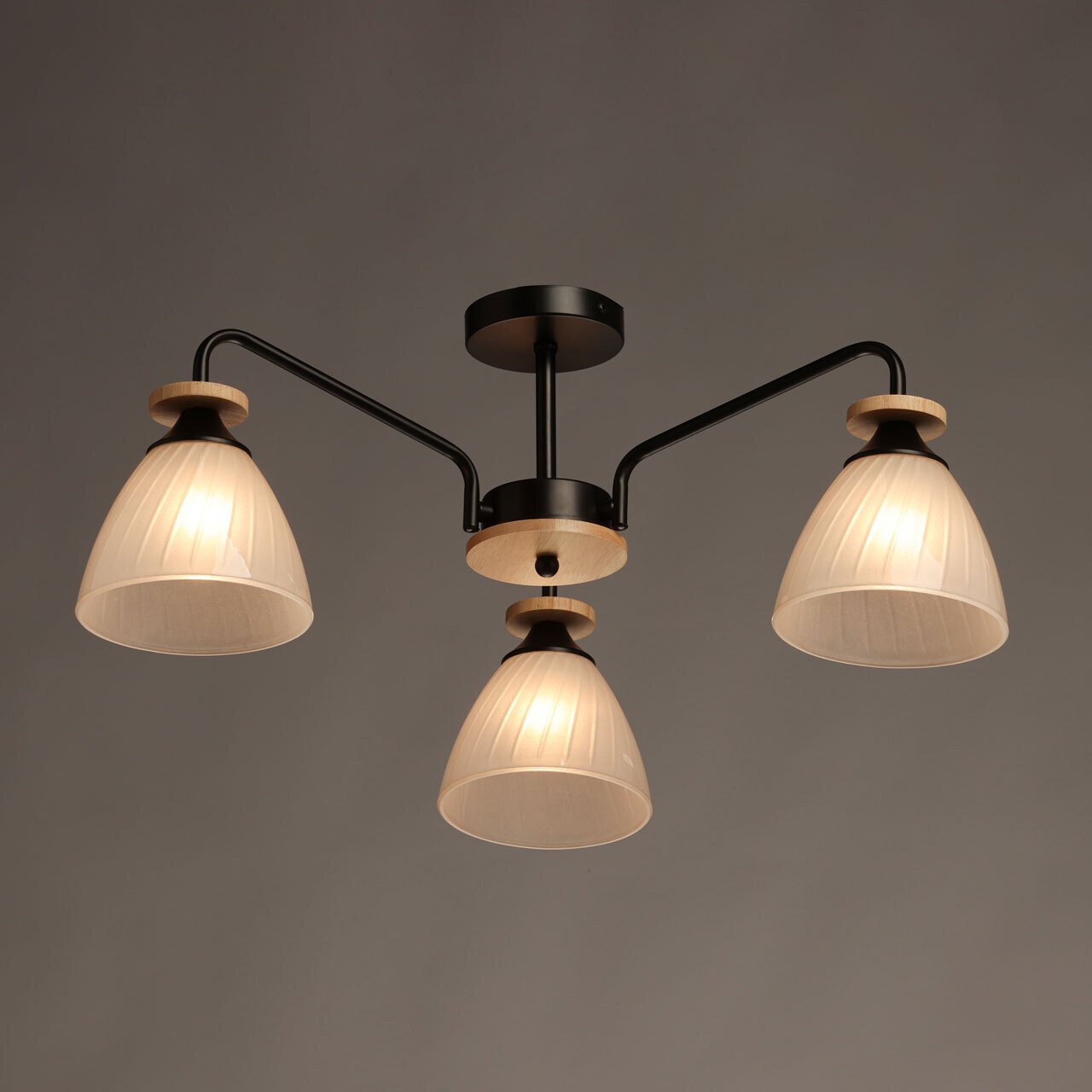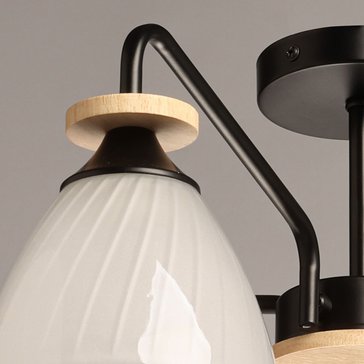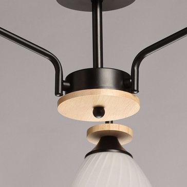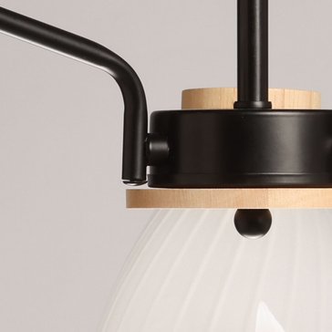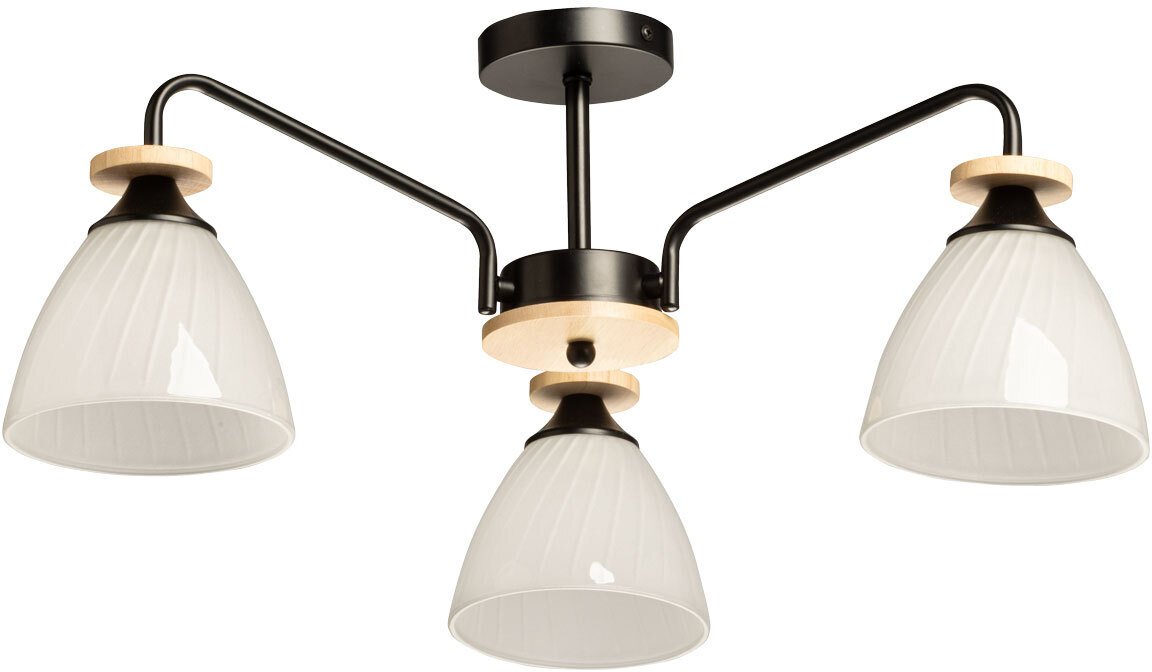 Благодаря простому и универсальному дизайну, эта люстра может быть использована в различных типах интерьеров, от современных до классических.Сочетание черного цвета и дерева является стильным и универсальным решением, которое вносит современность и элегантность в любой интерьер. Контраст этих двух элементов с белым цветом усиливает визуальное восприятие и добавляет изысканности пространству. Особый шарм создают белые стеклянные плафоны с лаконичным орнаментом, направленные вниз. Натуральности и теплоты в интерьер добавляют декоративные элементы из натурального дерева. Компактный размер люстры прекрасно подходит в интерьеры со стандартным потолком. Заменяемые источники света удобны в эксплуатации.