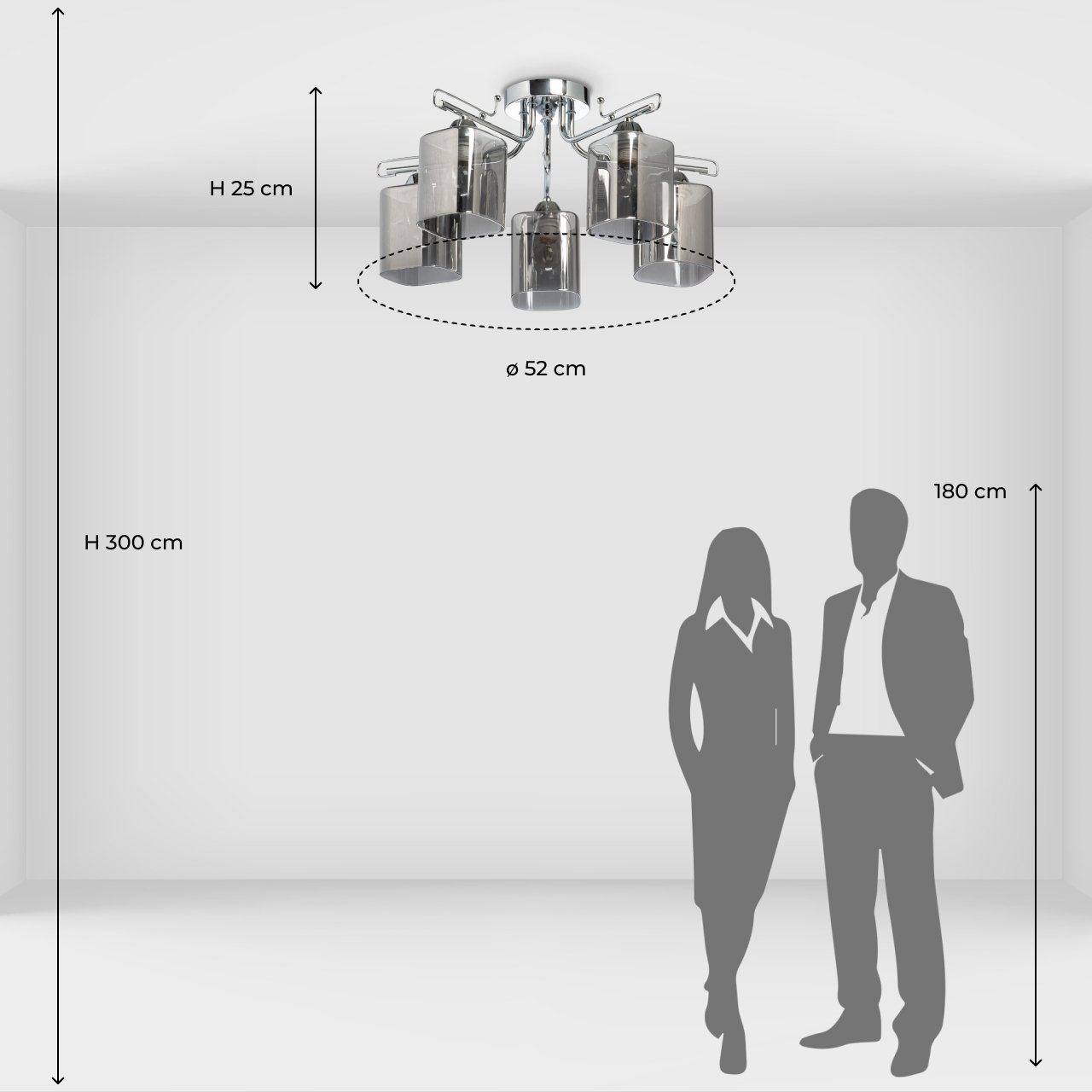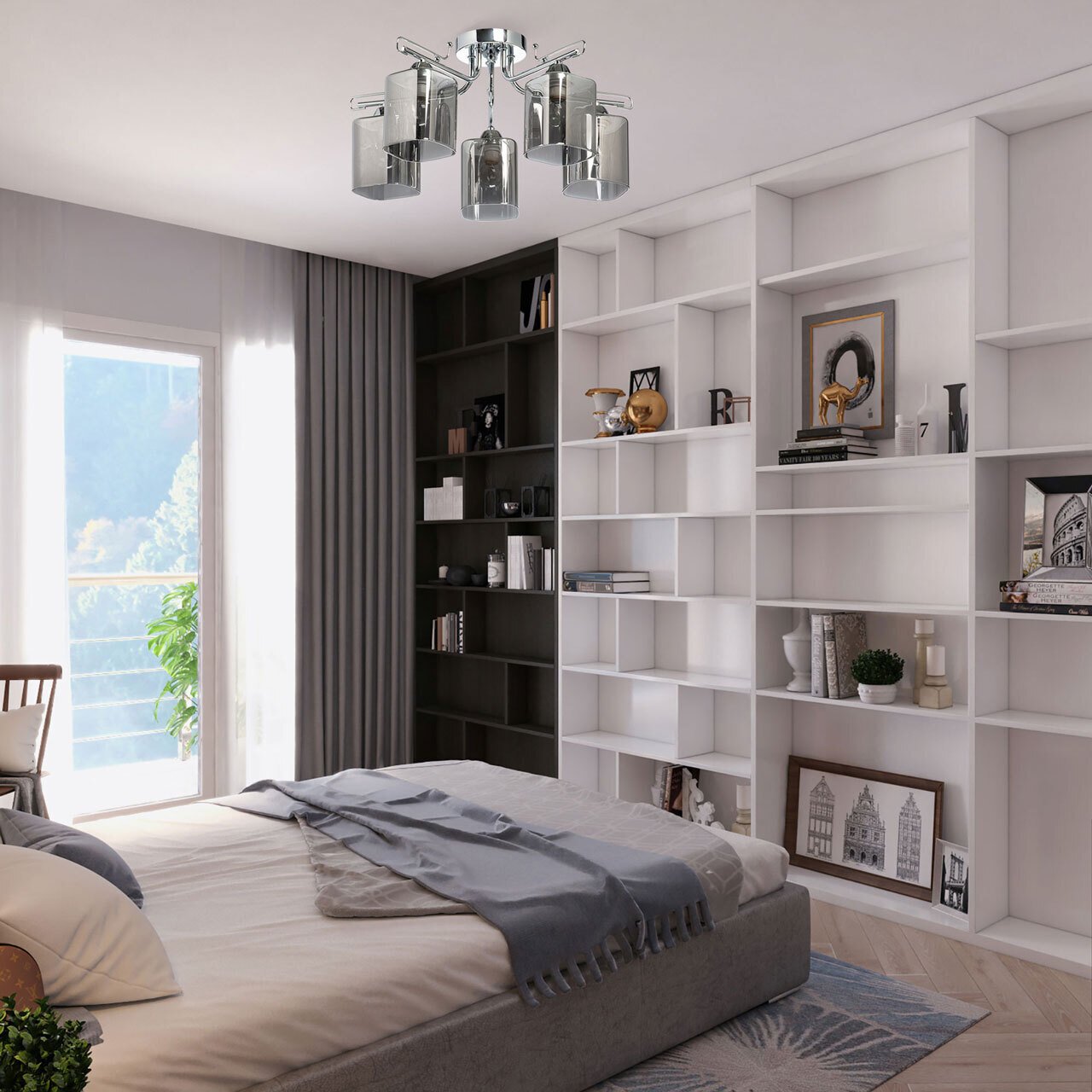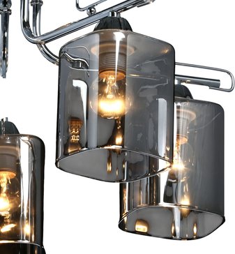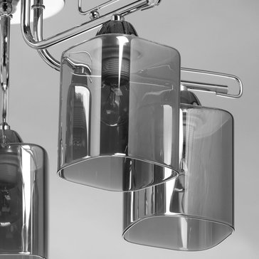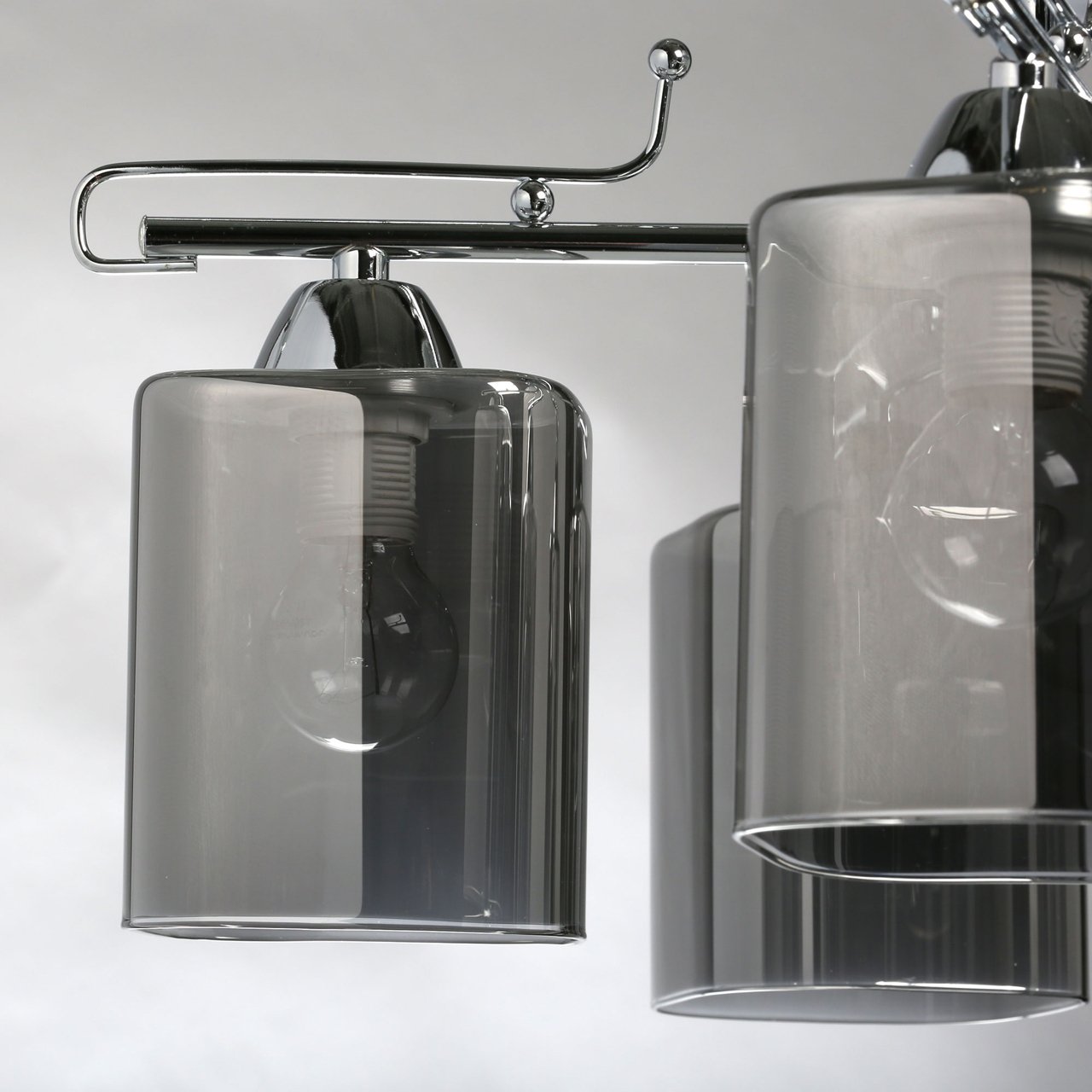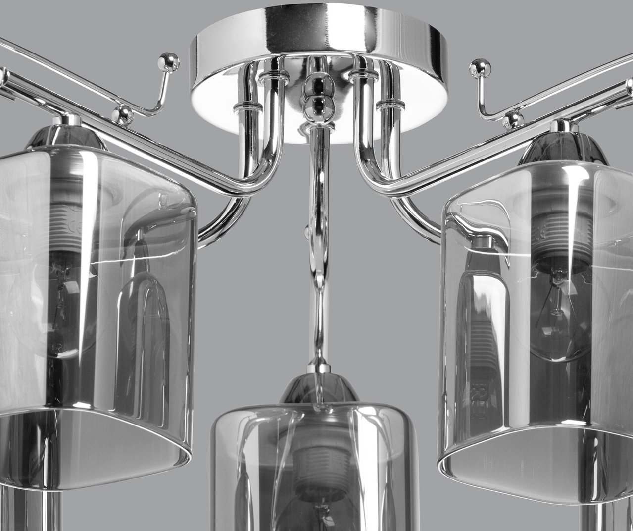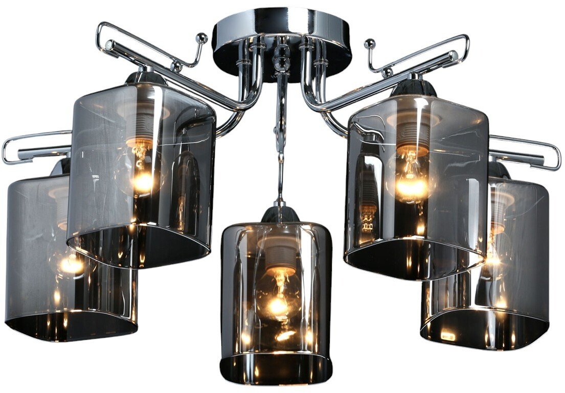 Люстра «Олимпия» (De City) — стильное потолочное освещение в современном дизайне. Модель выполнена в хромированном исполнении: металлическая основа с глянцевой отделкой гармонично сочетается с дымчатыми стеклянными плафонами цилиндрической формы. Конструкция состоит из пяти рожков, каждый рассчитан на лампу с цоколем E14 и мощностью до 40 Вт.